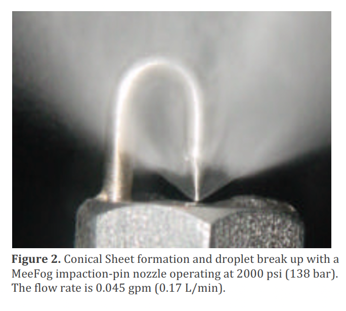 Atomizing fog nozzles create an expanding conical sheet of water. As the sheet expands, it thins. At a short distance from the orifice, aerodynamic forces overcome surface-tension forces, and the sheet breaks apart into small droplets and ligaments.