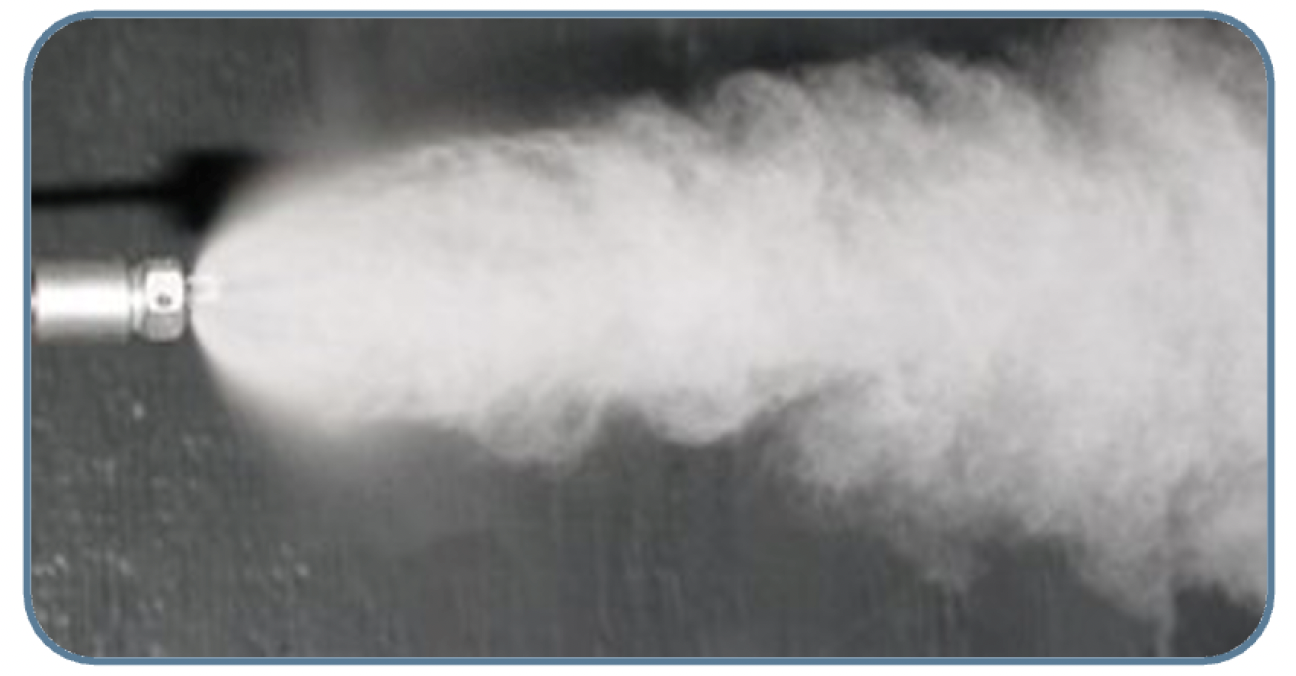 There are two types of air atomizing nozzles that are used with industrial fogging systems: impaction-pin nozzles and swirl-jet nozzles.