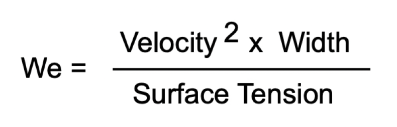 The atomization process itself is complex, but for purposes of comparing fog nozzle performance, it’s enough to know that the droplet size produced is inversely proportional to the Weber number (We). It’s presented with this equation: