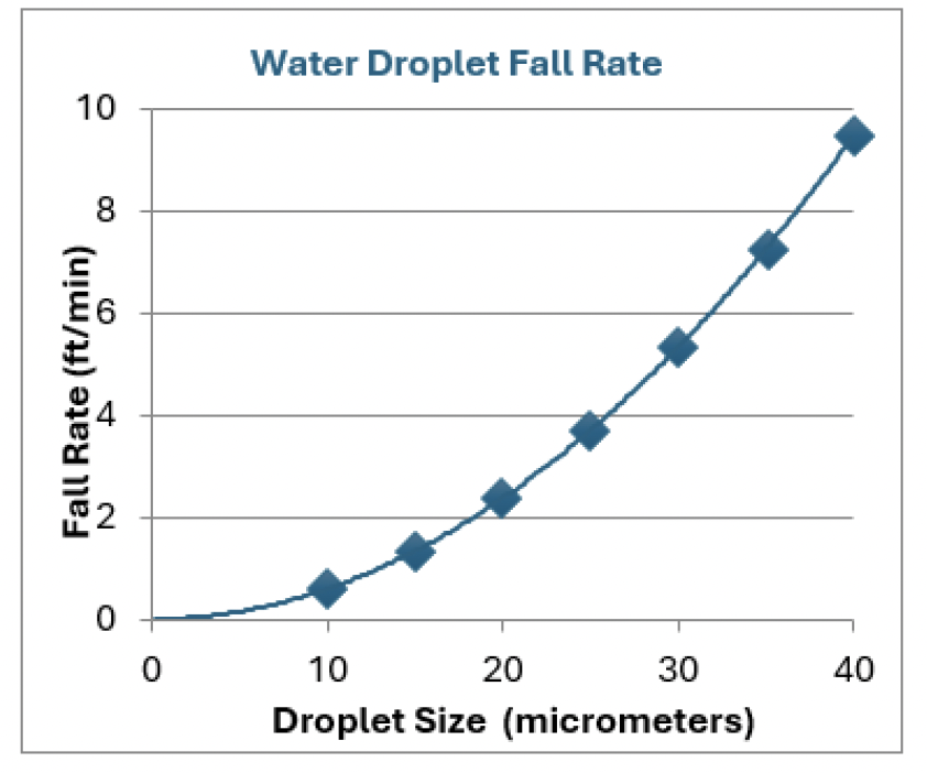 Small droplets also fall exponentially slower than larger droplets, which means they are more likely to evaporate before falling to the ground. A 30-micron droplet falls about twice as fast as a 20-micron droplet.