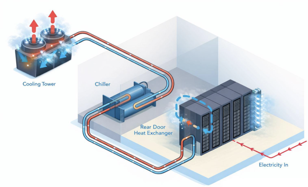 Liquid cooling removes heat directly at the server or rack level. Water, water glycol, or special dielectric fluids absorb heat from the chips and carry it into a facility’s water loop. That heat still has to be rejected outdoors, usually either directly through large air-cooled heat exchangers or dry coolers, or by chilling the water and pumping the heat to an outdoor chiller condenser.
